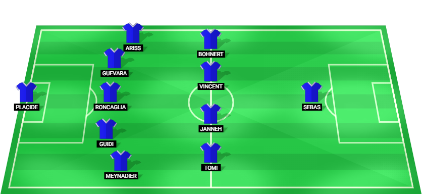 Placide (GK), Meynadier (DF), Guidi (DF), Roncaglia (DF), Guevara (DF), Ariss (DF), Tomi (MF), Janneh (MF), Vincent (MF), Bohnert (MF), Sebas (FW)