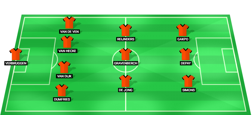 Verbruggen (GK), Dumfries (DF), Van Dijk (DF), Van Hecke (DF), Van de Ven (DF), De Jong (MF), Gravenberch (MF), Reijnders (MF), Simons (FW), Depay (FW), Gakpo (FW)
