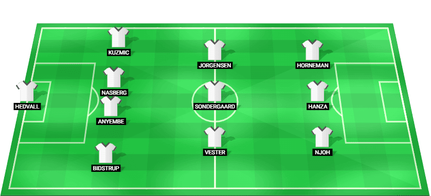 Hedvall (GK), Bidstrup (DF), Anyembe (DF), Nasberg (DF), Kuzmic (DF), Vester (MF), Sondergaard (MF), Jorgensen (MF), Njoh (FW), Hanza (FW), Horneman (FW).