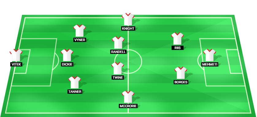 Vitek (GK), Tanner (DF), Dickie (DF), Vyner (DF), McCrorie (MF), Twine (MF), Randell (MF), Knight (MF), Borges (AM), Riis (AM), Mehmeti (FW).