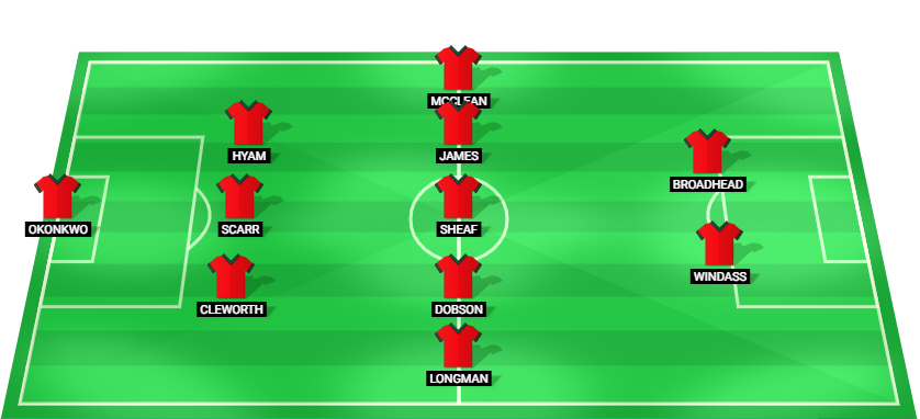 Okonkwo (GK), Cleworth (DF), Scarr (DF), Hyam (DF), Longman (MF), Dobson (MF), Sheaf (MF), James (MF), McClean (MF), Windass (FW), Broadhead (FW).