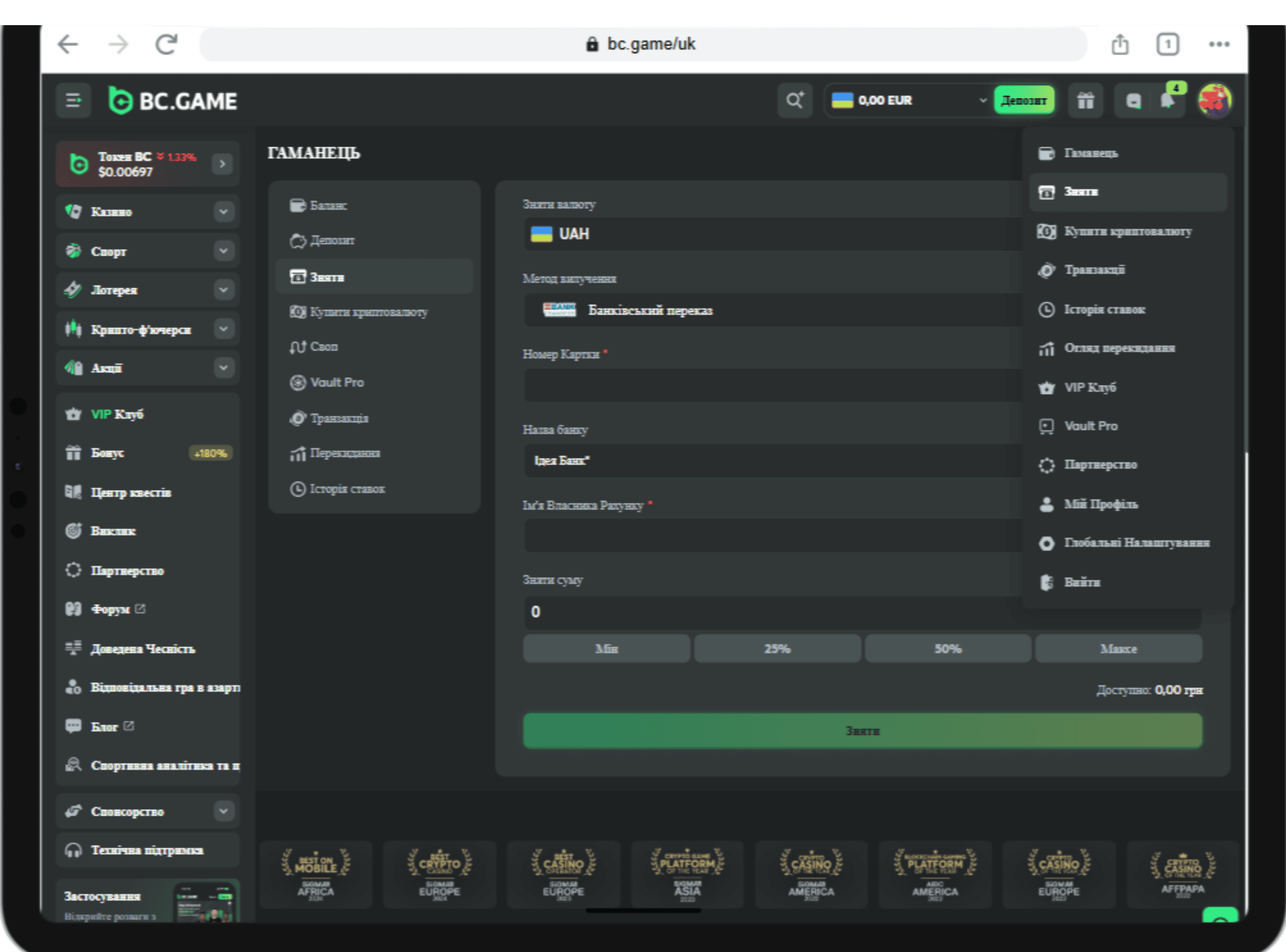 Введіть суму грошей, яку бажаєте вивести з вашого акаунта BC Game.