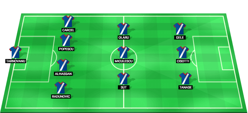 FCSB, ймовірно, виставить сильний склад, який поєднує атакувальний хист зі стабільністю в обороні, щоб домінувати вдома: Tarnovanu (GK), Radunovic (DF), Alhassan (DF), Popescu (DF), Carcel (DF), Sut (MF), Miculescu (MF), Olaru (MF), Tanase (FW), Cisotti (FW), Gele (FW).