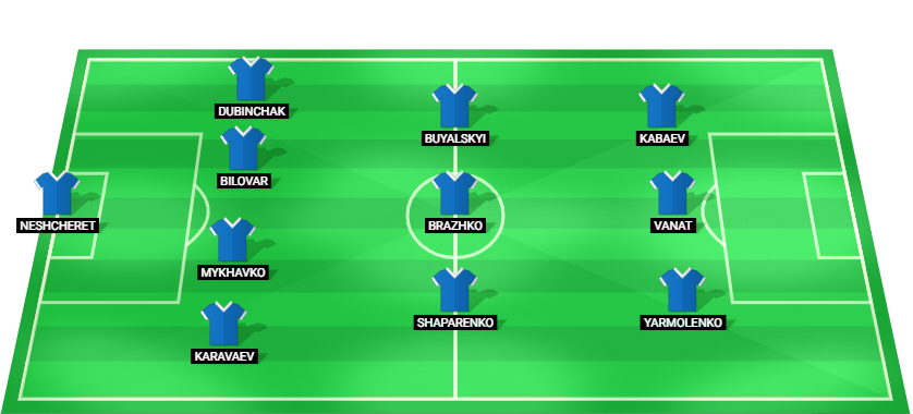 Neshcheret (GK), Karavaev (DF), Mykhavko (DF), Bilovar (DF), Dubinchak (DF), Shaparenko (MF), Brazhko (MF), Buyalskyi (MF), Yarmolenko (FW), Vanat (FW), Kabaev (FW).