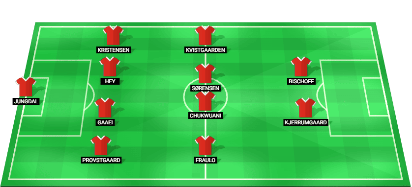 Jungdal (GK), Provstgaard (DF), Gaaei (DF), Hey (DF), Kristensen (DF), Fraulo (MF), Chukwuani (MF), Sørensen (MF), Kvistgaarden (MF), Kjerrumgaard (FW), Bischoff (FW).