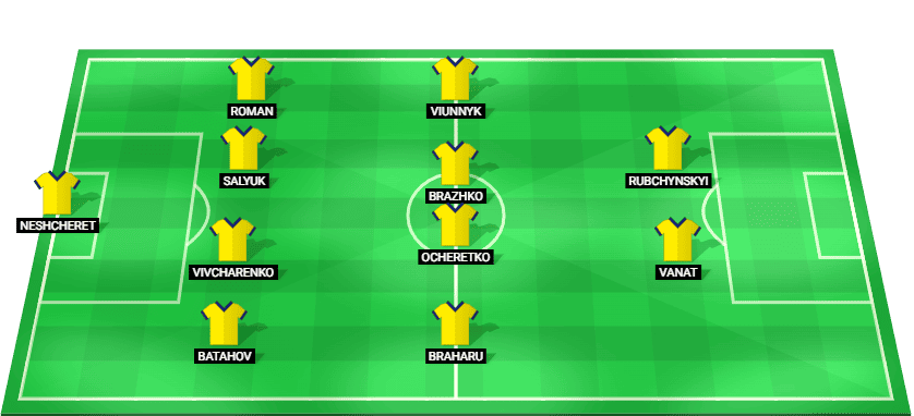 Neshcheret (GK), Batahov (DF), Vivcharenko (DF), Salyuk (DF), Roman (DF), Braharu (MF), Ocheretko (MF), Brazhko (MF), Viunnyk (MF), Vanat (FW), Rubchynskyi (FW).